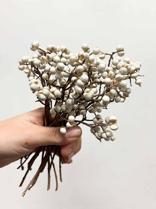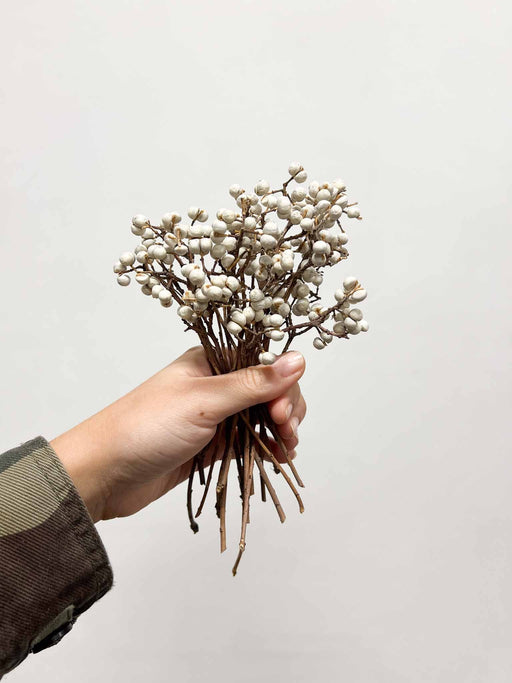 BloomoonMisure e quantitàNumero rami: 10 circaAltezza: da 15cm a 20cm circa Un delicato fascio di bacche naturali dal tono bianco avorio, essiccate con cur...